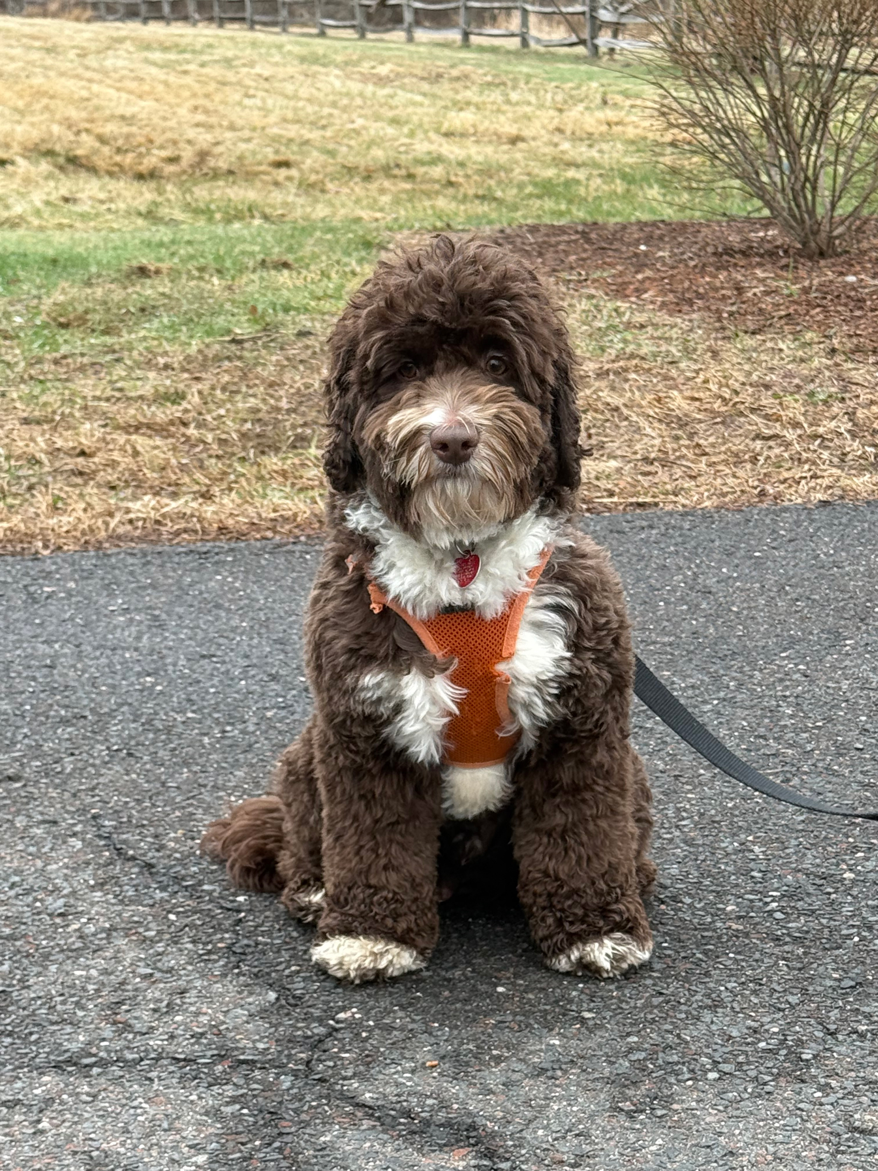 Shire is a very special dog for our program. He began with a dream when I bought a beautiful poodle in Germany with the same markings as him. She went to Italy and became a therapy dog, and from there, she came here to Massachusetts to have two litters for us. Shire is from her first litter. She is an Australian labradoodle. new genetic diversities!
